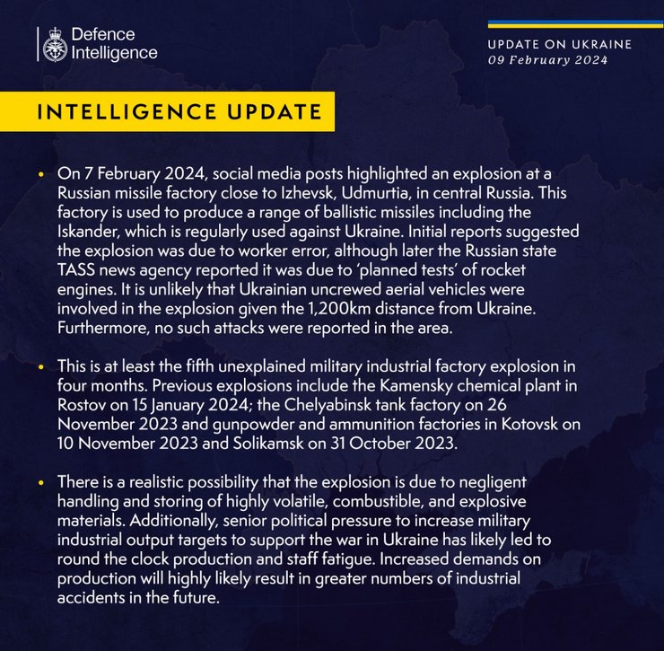Малоймовірно, що до вибуху на російському ракетному заводі біля Іжевська 7 лютого причетні українські безпілотні літальні апарати, проте, схожі інциденти на території Російської Федерації будуть продовжуватися. Про це 9 лютого заявили у Міністерстві оборони Великої Британії у Twitter.
