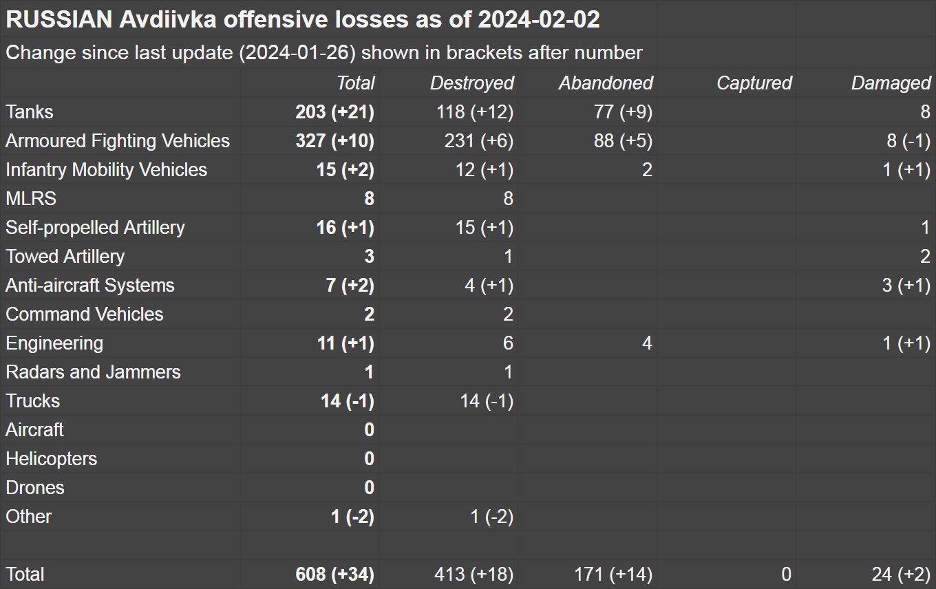 За радянськими показниками одна мотострілецька дивізія на папері мала 220 танків. Нинішня російська армія все ще дотримується радянських норм по танках. Відтак ЗС РФ вже втратили цілу дивізію танків, за даними OSINT-аналітика Naalsio, ворог втратив 222 танки Т-72, Т-80 і Т-90. При цьому українська армія втратила 18 танків за час оборони Авдіївки.