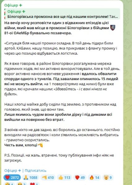 В районі Білогорівки на Луганщині групу бійців Сил оборони, які перебували в підземному тунелі засипало під час обстрілу КАБами. Окупанти змушували їх здатися в полон, але українські захисники відмовилися. Як їм вдалося вибратися з-під носа в окупантів, розповів у своєму телеграм-каналі "Офіцер+" лейтенант ЗСУ з позивним "Алекс".