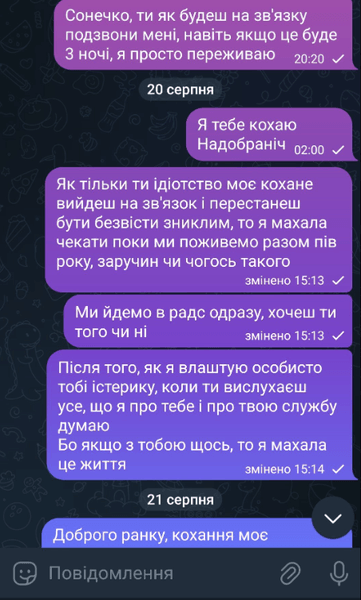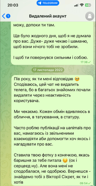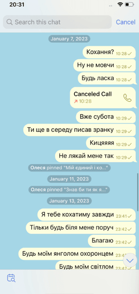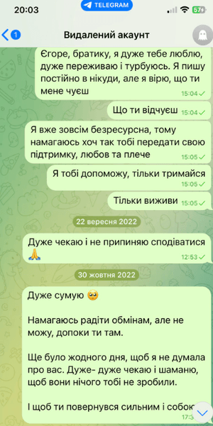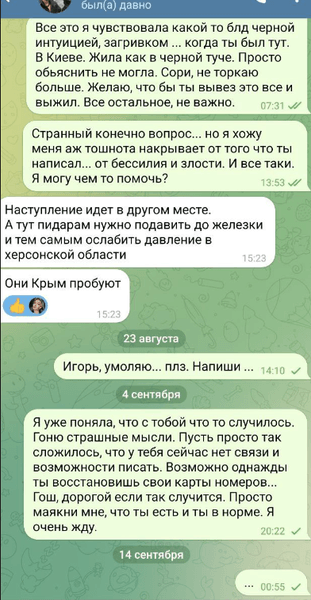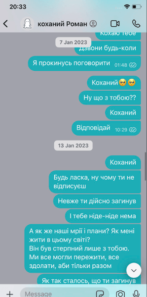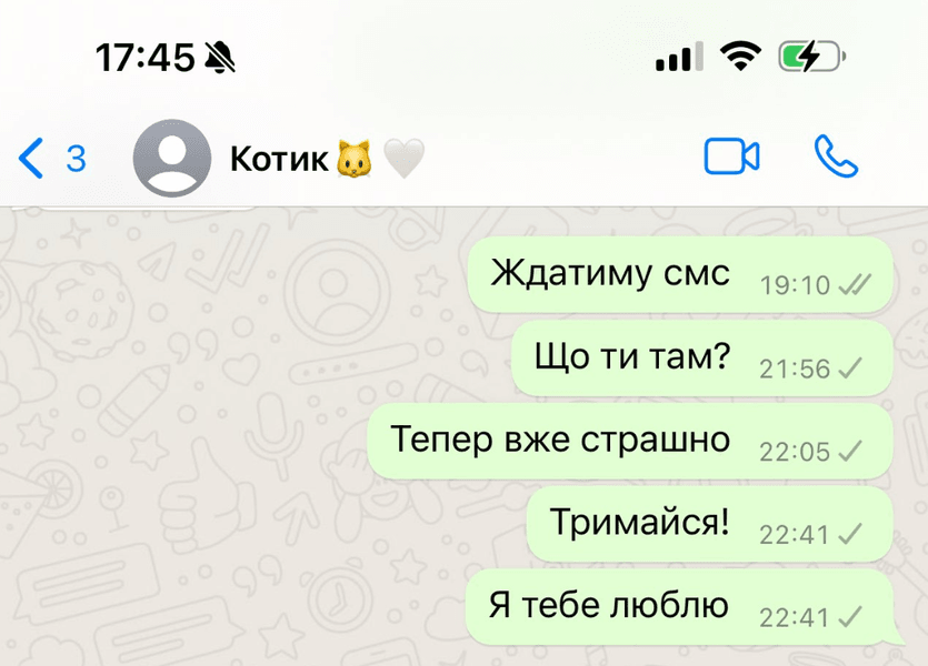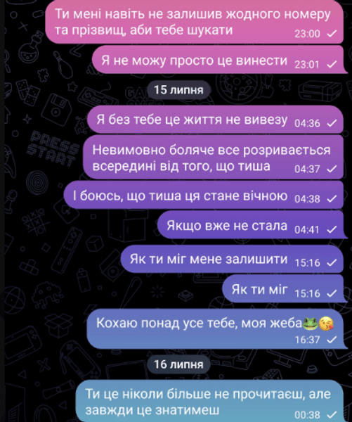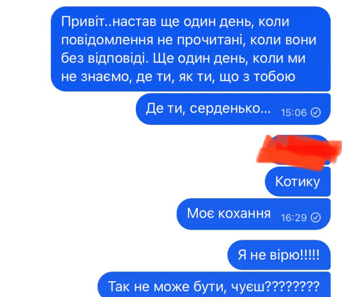 "Я без тебе це життя не вивезу", "Боюсь, що ця тиша стане вічною", "Киця, не лякай мене так", "Дуже чекаю і не припиняю сподіватись", "Де ти, серденько", — ось такі повідомлення навіки залишилися непрочитаними.