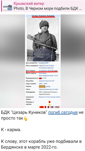 У соцмережах уже проводять паралелі. Мовляв, у той же день, що затонув корабель "Цезарь Куников", 14 лютого 1943 року помер радянський офіцері герой Радянського Союзу Цезар Куніков.