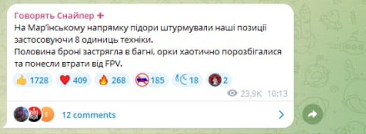 "На Марʼїнському напрямку п**ори штурмували наші позиції, застосувавши 8 одиниць техніки. Половина броні застрягла в багні, орки хаотично порозбігалися та понесли втрати від FPV", — проінформував він.