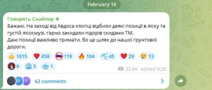 "На заході від Авдоса хлопці відбили деякі позиції в ліску та густій лісосмузі, гарно закидали підорів скидами ТМ (протитанкова міна — ред.). Ці позиції важливо тримати, бо це шлях до нашої ґрунтової дороги", — розповів він.