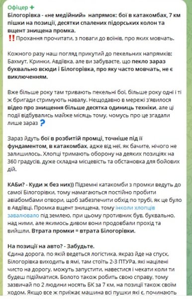 "Білогорівка — "не медійний" напрямок: бої в катакомбах, 7 км пішки на позиції, десятки спалених п**орських колон та вщент знищена промка. Вже понад рік там тривають пекельні бої, понад рік одні і ті ж бригади стримують навалу. Зараз йдуть бої в розбитій промці, точніше під її фундаментом, в катакомбах, адже від неї нічого не залишилось. Хлопці тримають оборону на деяких позиціях на 360 градусів, дуже складна місцевість та обстановка для бойових дій", — розповідає військовий.