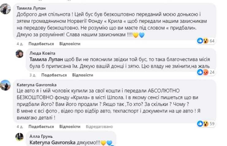"Це авто я і мій чоловік купили за свої кошти і передали абсолютно безкоштовно фонду "Крила" в місті Шпола. І в якому сенсі пишеться, що ви придбали його? Вам його продали? Якщо так ,то хто? За скільки? Чому? Я вимагаю деталей", — написала вона.