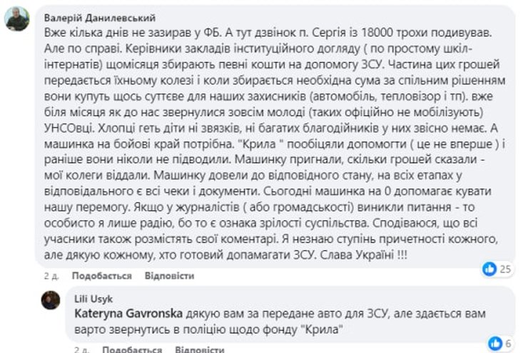 "Крила " пообіцяли допомогти і раніше вони ніколи не підводили. Машинку пригнали, скільки грошей сказали — мої колеги віддали. Машинку довели до відповідного стану, на всіх етапах у відповідального є всі чеки і документи. Сьогодні машинка на 0 допомагає кувати нашу перемогу. Якщо у журналістів ( або громадськості) виникли питання — то особисто я лише радію, бо то є ознака зрілості суспільства. Сподіваюся, що всі учасники також розмістять свої коментарі", — написав він.