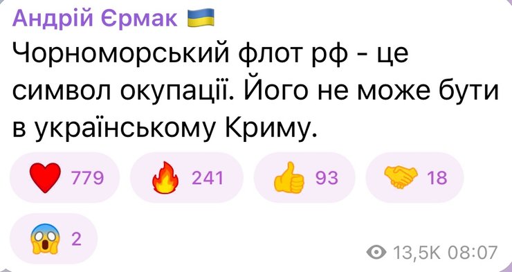 Зазначимо, раніше керівник Офісу президента України Андрій Єрмак у своєму Telegram оприлюднив повідомлення з "натяком", у якому заявив, що "Чорноморський флот РФ — це символ окупації. Його не може бути в українському Криму".