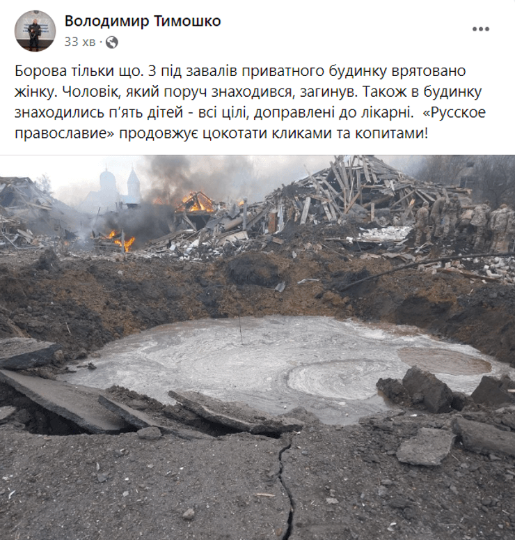 "З-під завалів приватного будинку врятовано жінку. Чоловік, який поруч знаходився, загинув. Також в будинку знаходились пʼять дітей — всі цілі, доправлені до лікарні. "Русское православие" продовжує цокотати кликами та копитами", — написав він у Facebook.