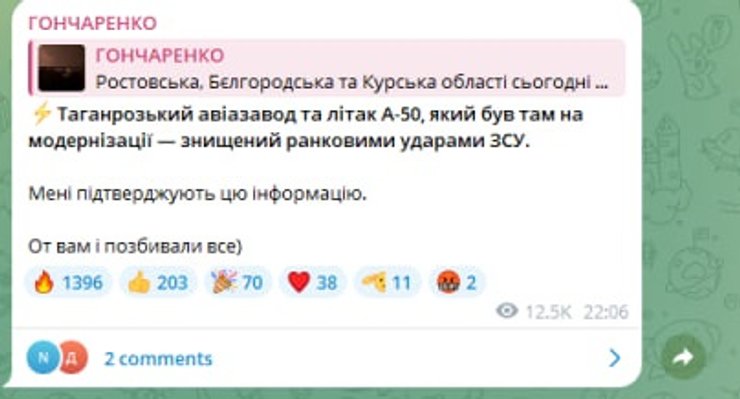 "Таганрозький авіазавод та літак А-50, який був там на модернізації — знищений ранковими ударами ЗСУ. Мені підтверджують цю інформацію. От вам і позбивали все", — написав Гончаренко.