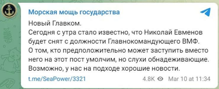 Головнокомандувач Військово-морським флотом (ВМФ) Росії Микола Євменов пішов у відставку. Замість нього тимчасово виконувачем обов'язків головкома ВМФ призначили командувача Північного флоту РФ адмірала Олександра Моїсеєва. Про це 10 березня повідомили профільні російські Telegram-канали.