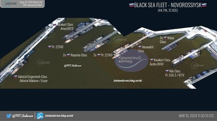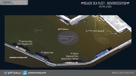 У мережі інтернет з'явилися супутникові знімки Новоросійської військово-морської бази, на яких видно, що більшість кораблів Чорноморського флоту Росії перебуває в порту. Про це повідомляє 11 березня моніторингова група телеграм-каналу "Кримський вітер".