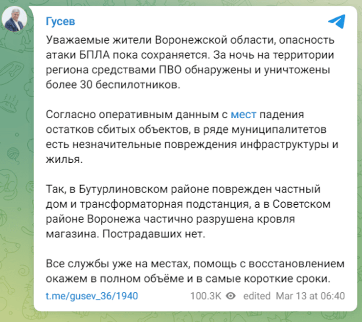 Нагадаємо, в ніч на 13 березня губернатор Воронезької області Олександр Гусєв повідомив про атаку БПЛА. Аналогічні повідомлення з'явилися від губернаторів Курської, Бєлгородської та Рязанської областей.