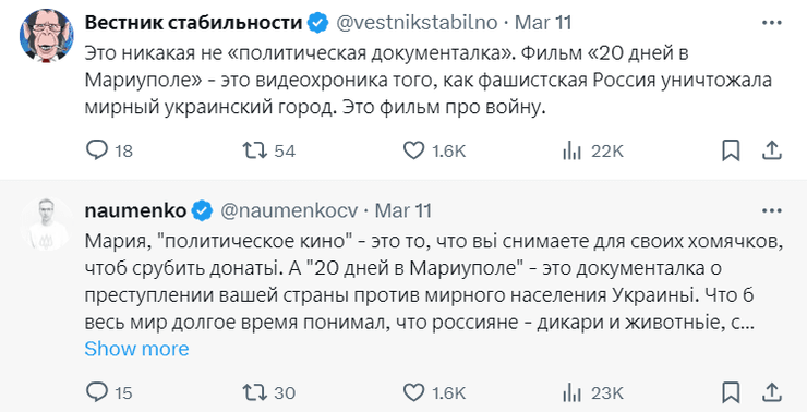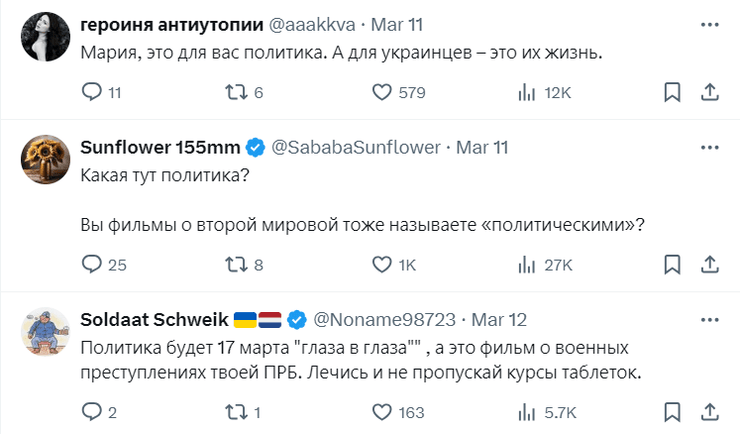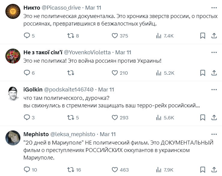 Допис росіянки обурив багатьох користувачів соцмережі X. У коментарях їй написали, що фільм "ніяка не політична документалка". "20 днів у Маріуполі" – це відеохроніка того, як фашистська Росія знищувала мирне українське місто. Це фільм про війну".