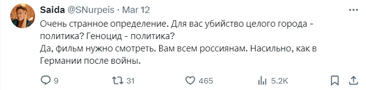 "Для вас вбивство цілого міста – політика? Геноцид – політика? Так, фільм варто дивитися. Вам усім росіянам. Насильно, як у Німеччині після війни". — йдеться у дописі.