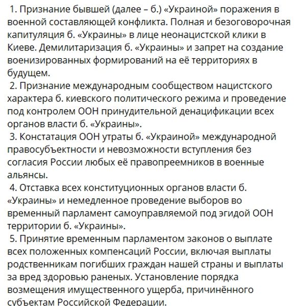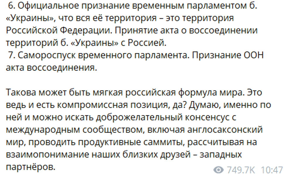 ВажливоМедведєв наголосив на тому, що варто досягти так званого "консенсусу із міжнародною спільнотою". Він вважає, що Україна має оголосити "повну і беззастережну капітуляцію", "провести демілітаризацію". Колишній російський президент наполягає на тому, щоб "відправити у відставку всі конституційні органи влади" та "негайно провести вибори до тимчасового парламенту".