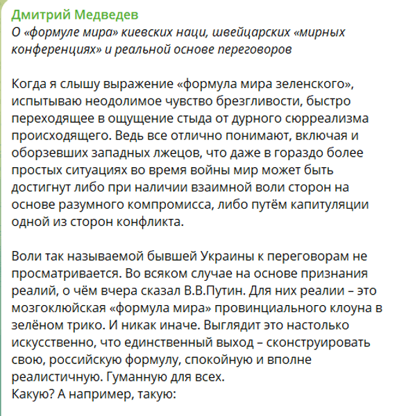 Дмитро Медведєв, заступник голови Радбезу РФ, запропонував так звану "російську формулу миру", яка передбачає повне знищення України. Свою заяву він опублікував у Telegram.