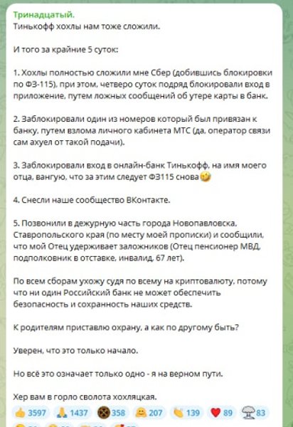 "Х*хли повністю склали мені Сбер, заблокувавши по ФЗ-115. Водночас чотири доби поспіль блокували вхід у додаток шляхом хибних повідомлень про втрату картки в банк. Заблокували один із номерів, який був прив'язаний до банку, шляхом злому особистого кабінету МТС (так, оператор зв'язку сам о**їв від такої подачі). Заблокували вхід в онлайн-банк "Тінькофф", на ім'я мого батька, знесли нашу спільноту ВКонтакте", — пожалівся Гузенко.