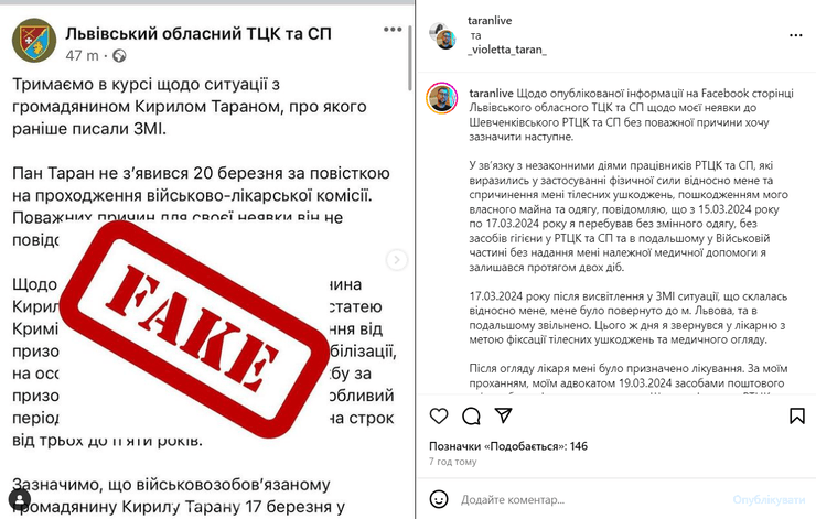 Таран ситуацію прокоментував у соцмережі Instagram. Він повідомив, що з 15 по 17 березня перебував з тілесними ушкодженнями без змінного одягу і засобів гігієни у РТЦК та СП та надалі у Військовій частині, де йому не надали належної медичної допомоги. Після того, як ситуація з його затриманням набула розголосу у ЗМІ, чоловіка звільнили. За словами Тарана, 17 березня він звернувся до медзакладу, після чого йому призначили лікування.