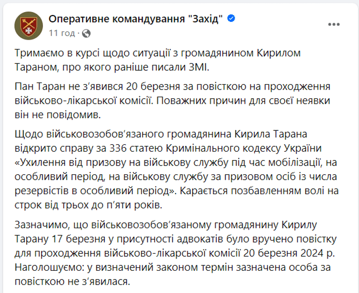 "Пан Таран не зʼявився 20 березня за повісткою на проходження військово-лікарської комісії. Поважних причин для своєї неявки він не повідомив", — заявили в ОК "Південь".