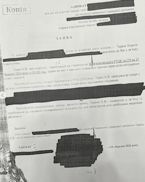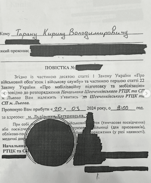 У ТЦК заявили, що Кирило Таран не з'явився за повісткою на проходження військово-лікарської комісії і не повідомив причини неявки. Чоловік звинувачення відкидає і вважає повідомлення ТЦК тиском на себе та правоохоронні органи.