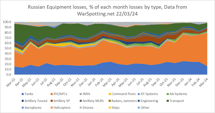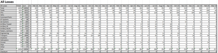 Крім цього, він показав співвідношення всіх втрат техніки щомісяця та як відсотковий показник від загальних втрат у березні.