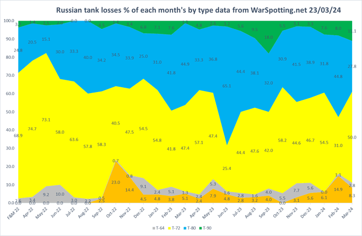 На додаток він порівняв дані всіх втрат ворожих танків за типом щомісяця. За його словами, помітне зниження відсоткового значення Т-80, тоді як втрати Т-90 і Т-72 зросли.