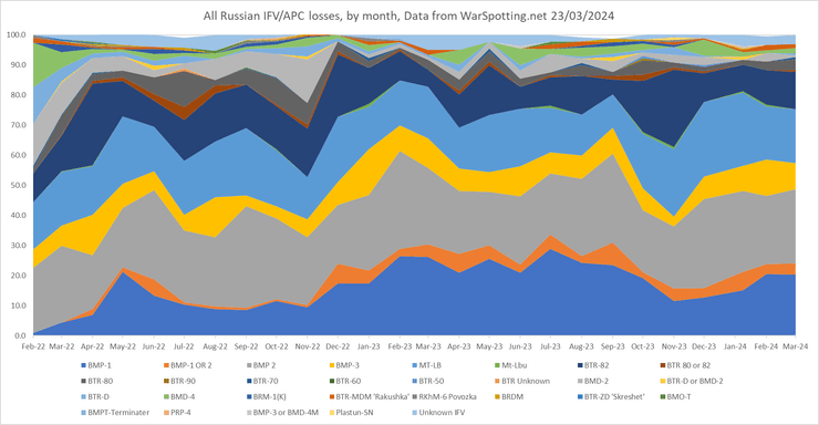 Він наголосив, що спостерігаючи за загальними втратами ЗС РФ цього місяця, можна помітити, що зросло знищення БМП-1 та знизилося БМД-2. Проте суттєвих змін не відбулося, якщо порівнювати з лютим або січнем.