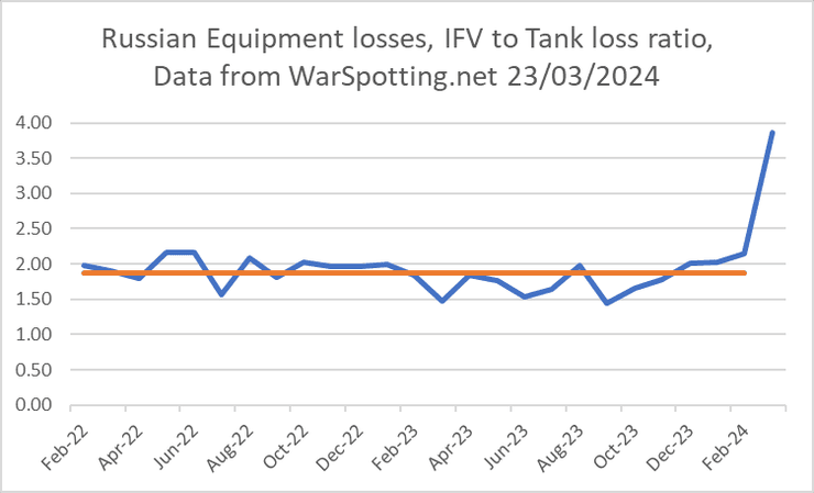 Він зауважив, що протягом повномасштабного вторгнення співвідношення ворожих втрачених танків до бойових бронемашин було близьким до середнього показника 1,87, максимум якого досягав 2,17. Проте у березні цей показник зріс до 3,87 та 6,8 за десять днів.