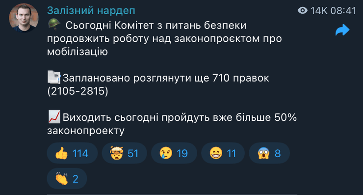 "Сьогодні Комітет з питань безпеки продовжить роботу над законопроєктом про мобілізацію. Заплановано розглянути ще 710 правок (2105-2815)", — сказав Ярослав Железняк.