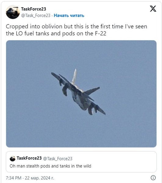 Автори публікації пишуть, що F-22 володіє і без того низькими характеристиками радіолокаційної помітності, тепер же був помічений модернізований варіант літака з інфрачервоними стелс-датчиками. Як повідомили OSINT-спостерігачі, випробувальний політ винищувача проходив у районі аерокосмічного порту Мохаве, недалеко від авіабази Edwards Air Force Base ВПС США.