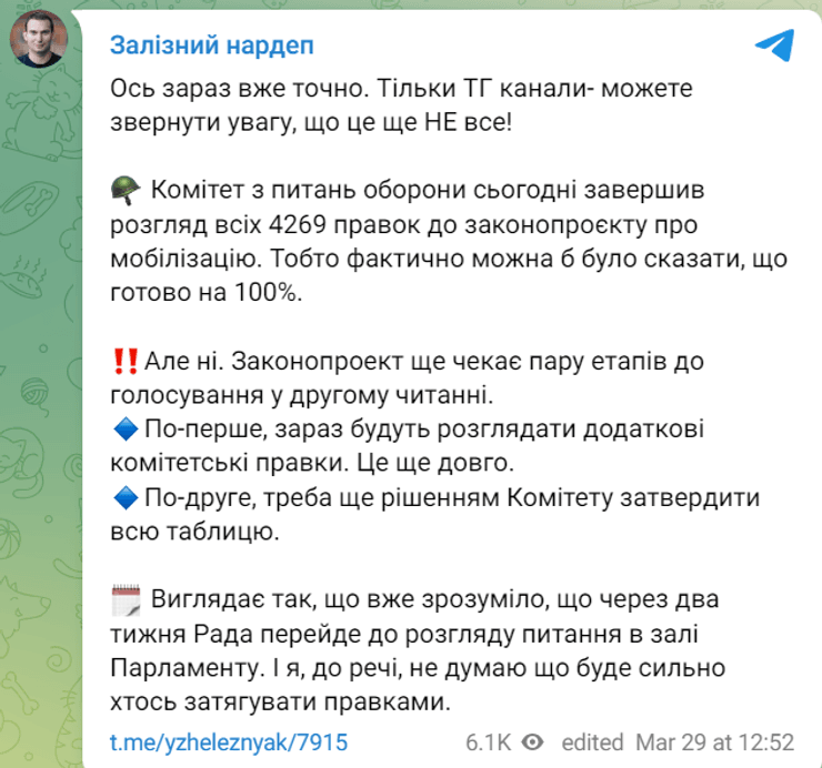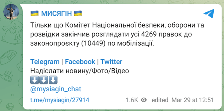 Заступник комітету ВРУ з питань нацбезпеки, оборони і розвідки Юрій Мисягін у своєму Telegram-каналі також підтвердив, що профільний комітет закінчив розгляд усіх правок.