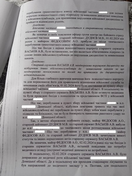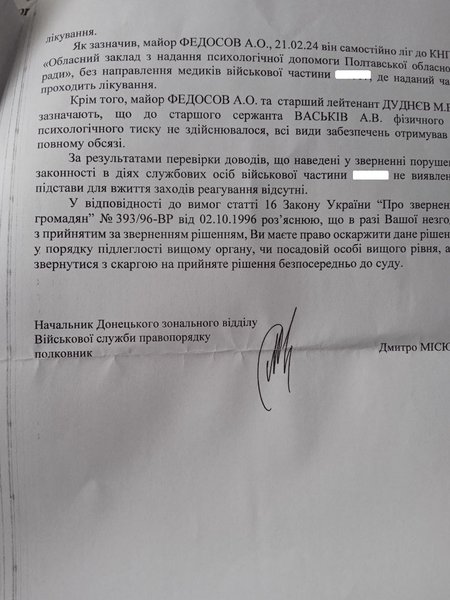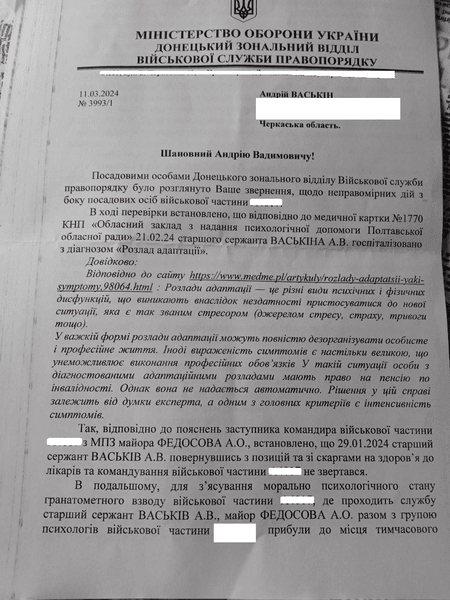 Відповідь, отримана від Донецького зонального відділу Військової служби правопорядку Міноборони, пояснювала, що бійця посадили до підвалу у зв'язку з повітряною тривогою, коли військовослужбовцям було рекомендовано перебувати в безпечних місцях через імовірність ракетного удару по тій місцевості.