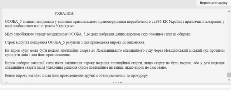 "Відповідно до довідки військово-лікарської комісії №691 від 20.07.2023, вбачається, що обвинвачений за наявності діагнозу "вірусний гепатит "С" безжовтянична форма без порушень функції печінки" — придатний до військової служби", — йдеться у вироку. Суд визнав чоловіка винним за статтею 336 ККУ та засудив до 3 років позбавлення волі.