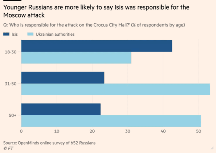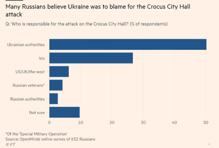 В останній день березня Financial Times опублікувала дані соцопитування серед росіян щодо того, хто, на їхню думку, причетний до теракту. Як зауважує видання, більше половини респондентів стверджують, що за стріляниною в Москві стоїть Київ, попри те, що ІДІЛ узяла на себе відповідальність