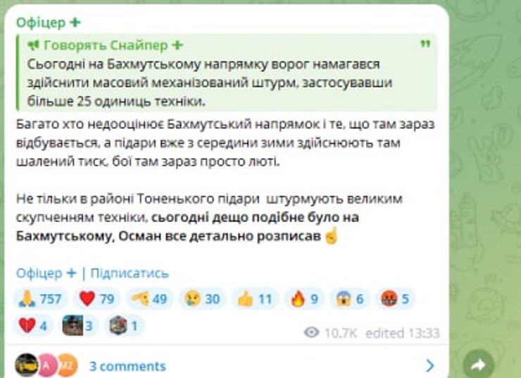 "Багато хто недооцінює Бахмутський напрямок і те, що там зараз відбувається, а п**ари вже з середини зими здійснюють там шалений тиск, бої там зараз просто люті. Не тільки в районі Тоненького п**ари штурмують великим скупченням техніки, сьогодні дещо подібне було на Бахмутському", — проінформував він.