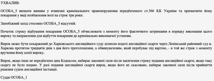 Суд визнав чоловіка винним за статтею 366 Кримінального кодексу України й засудив його до трьох років позбавлення волі.
