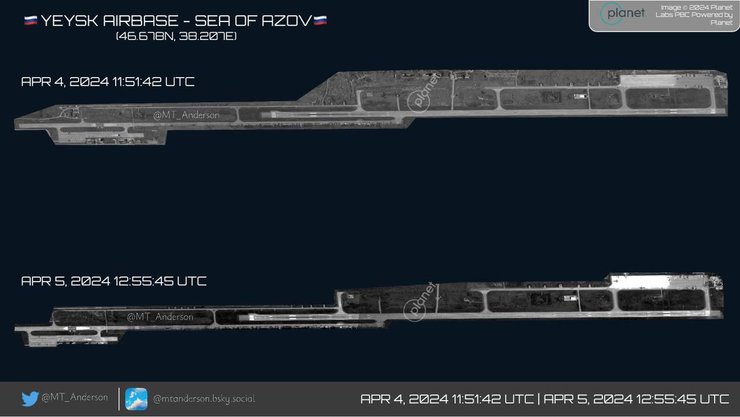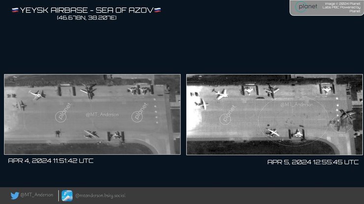 "Радіо Свобода" опублікувала порівняння супутникових знімків авіабази ПКС РФ під Морозовськом у Ростовській області, зроблених об 11 ранку 4 квітня і в цей самий час 5 квітня.