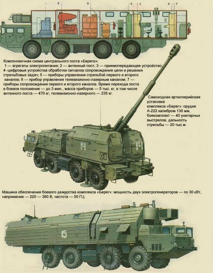 А-222 "Берег" — це самохідний артилерійський комплекс, який було взято на озброєння армії РФ 1996 року. Роботи над створенням зброї велися ще в 70-х роках минулого століття і були обумовлені одним важливим моментом. Справа в тому, що ще радянські військові фахівці дійшли висновку, що для захисту узбережжя недостатньо протикорабельних ракет, і для закриття "мертвих зон" потрібна саме ствольна артилерія з дальністю стрільби не більше десятків кілометрів.