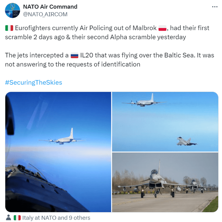 Російський літак, який має сучасну радіолокаційну систему для збору розвідданих, не відповів на запити про ідентифікацію. Об'єднане командування ВПС НАТО з питань повітряного простору (AIRCOM) опублікувало знімки винищувачів на флангу Іл-20.