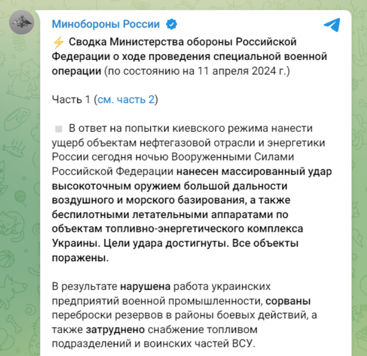 Міноборони Росії заявило, що вночі відбулися атаки по об'єктах енергетики України "у відповідь на спроби завдати шкоди об'єктам нафтогазової галузі та енергетики РФ". У Telegram відомства опублікована відповідна заява.