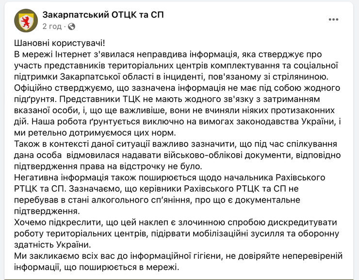 У пресслужбі Закарпатського ОТЦК та СП заперечили участь представників ТЦК та СП Закарпатської області в інциденті.