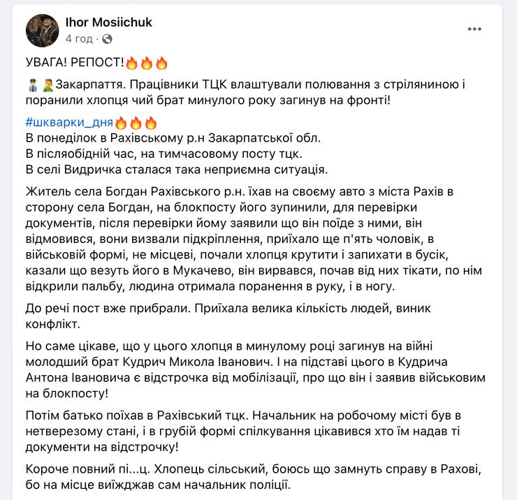 "Працівники ТЦК влаштували полювання зі стріляниною і поранили хлопця, чий брат минулого року загинув на фронті!" — написав Ігор Мосійчук.