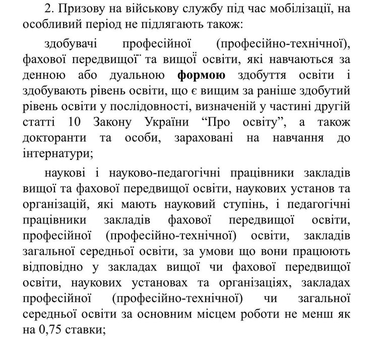 Фахової передвищої освіти, професійної освіти та загальної середньої освіти, за умови, що вони працюють у відповідних навчальних закладах за основним місцем роботи не менш як на 0,75 ставки, звільняються від мобілізації.