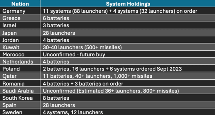 За даними, американського оглядача Стіва Брауна, у переліку країн, які мають найбільше систем ППО Patriot — Німеччина, Нідерланди, Кувейт, Тайвань, Греція, ОАЕ, Тайвань, Туреччина.