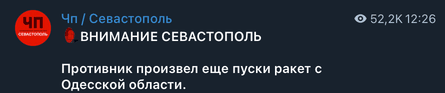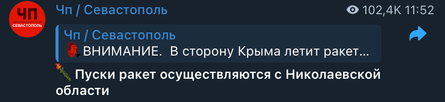 У Telegram-каналі "ЧП / Севастополь" розповіли, що по Криму нібито було запущено декілька крилатих ракет типу Storm Shadow / Scalp. Водночас російська протиповітряна оборона нібито збиває їх, зокрема над морем, на підльоті до Євпаторії та Севастополя.
