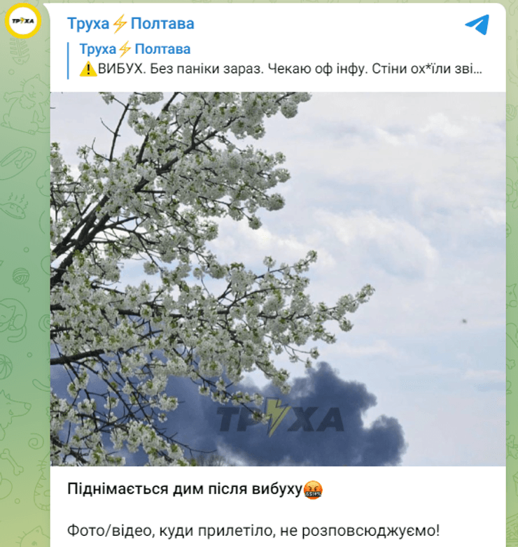 "Ворог атакував Полтаву. Було чутно звук вибуху. Всі деталі уточнюються. Зберігайте спокій та інформаційну тишу", — заявив Пронін, нагадавши, що не можна поширювати жодних фото і відео.