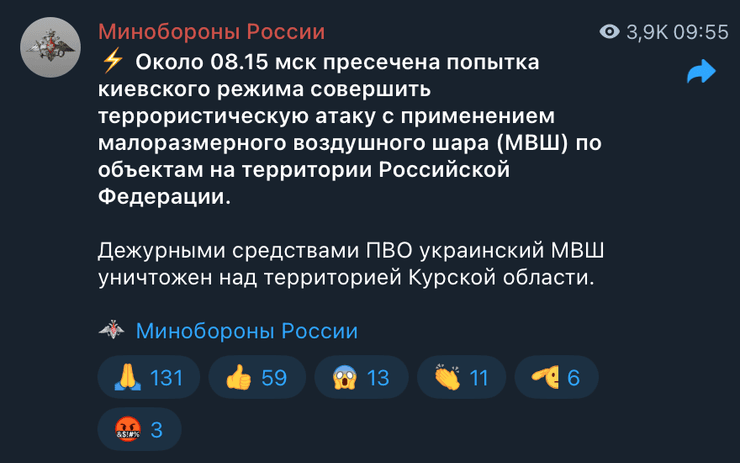 За інформацією Міноборони РФ, Київ намагався здійснити "терористичну атаку" із застосуванням малорозмірної повітряної кулі в Курській області.