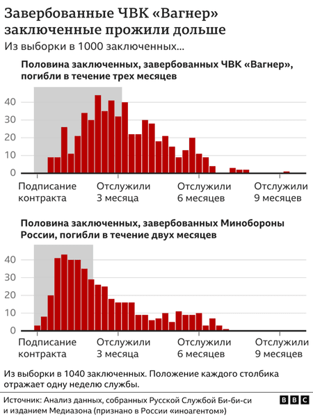 "Аналіз зібраних даних показує, що втрати вагнерівців розподілені більш-менш рівномірно. А ось ув'язнені, які воювали у підрозділах Міноборони, гинули незабаром після приїзду на фронт. Половину всіх встановлених нами загиблих ув'язнених із ПВК "Вагнер" було вбито через три місяці після підписання контракту. У випадку із загонами "Шторм" — половина відомих загиблих засуджених була вбита протягом перших 8 тижнів на фронті — тобто в середньому вони жили на місяць менше, ніж ув'язнені вагнерівці", — пише видання.
