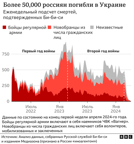 Ліквідований в РФ керівник ПВК "Вагнер" Євген Пригожин заявляв, що втрати РФ в Бахмуті склали 22 тисячі вбитими. Журналісти змогли встановити імена лише 10 348 із них, тобто трохи менше половини.