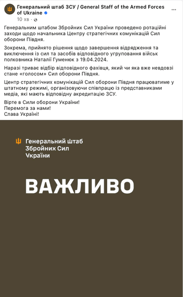 "Генеральним штабом Збройних Сил України проведено ротаційні заходи щодо начальника Центру стратегічних комунікацій Сил оборони Півдня", — йдеться у повідомленні.